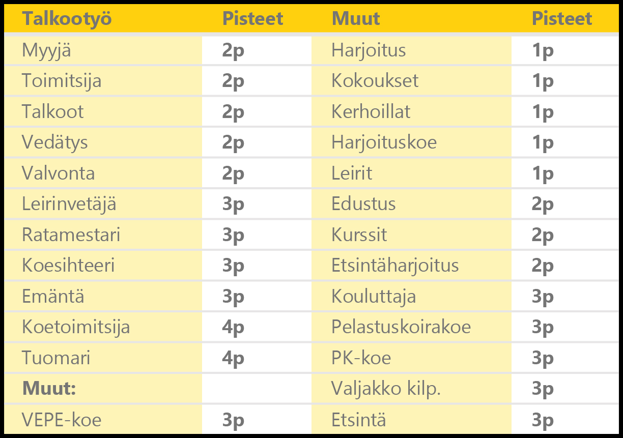 Yhdistys jakaa vuosittain kilpailurahastosta muistamisia talkoissa ja kokeissa aktiivisesti toimineille koirakoille. Toimita pyydetyt tiedot yhdistyksen kokouksen vuosittain vahvistamaan päivämäärään mennessä, jotta tuloksesi voidaan huomioida palkitsemisissa.